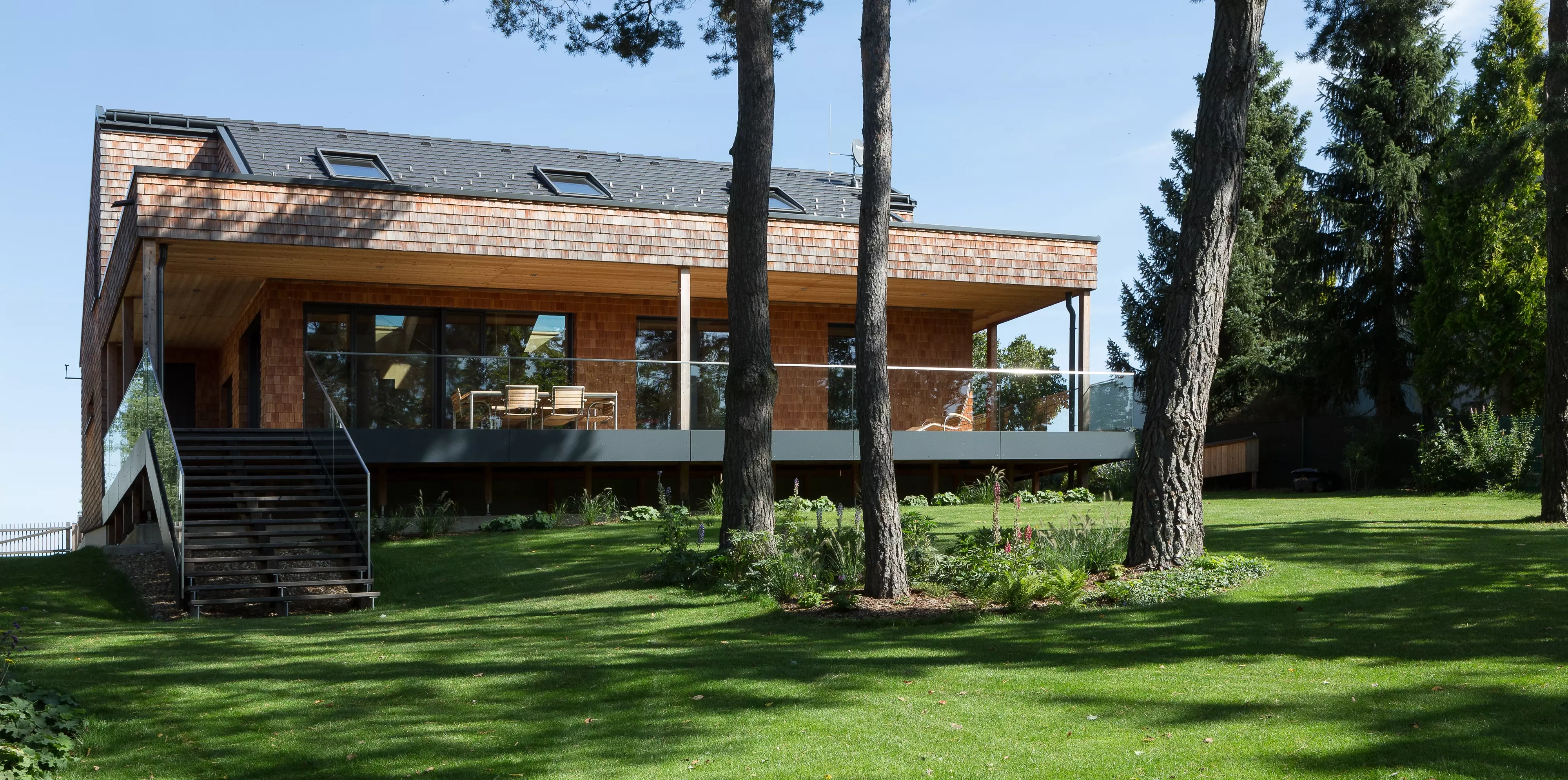 Ferestrele de mansardă asigură intimitate deplină și oferă un joc continuu al luminii naturale în încăperi. În interiorul acestei locuințe, pur și simplu uiți de clădirile din jur și te concentrezi pe grădina care se aseamănă cu o pădure.