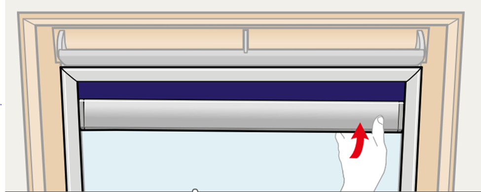 Rulourile electrice și solare pot fi acționate și manual, dacă este necesar. Pentru aceasta, înclină partea de jos a barei de control spre interior, către geam (așa cum este ilustrat în diagrama de mai jos). Ținând bara în această poziție înclinată, poți glisa ruloul în sus sau în jos până la poziția dorită.